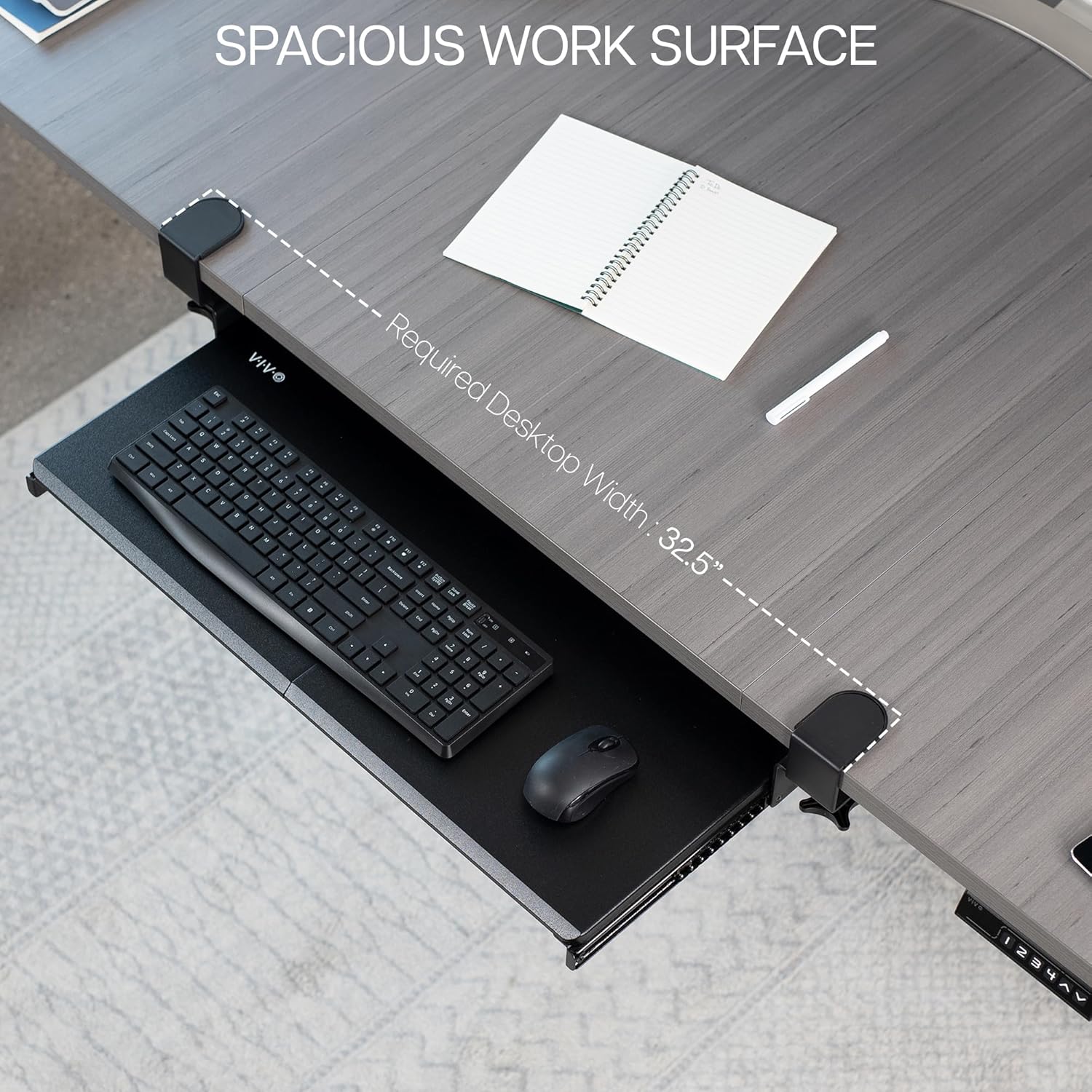 The Large Keyboard Tray Under Desk Pull Out is a convenient and ergonomic solution for maximizing desk space and improving typing comfort. This slide-out platform features a spacious 27 x 11 inch surface (33 inches including clamps) that can accommodate your keyboard and mouse with ease.