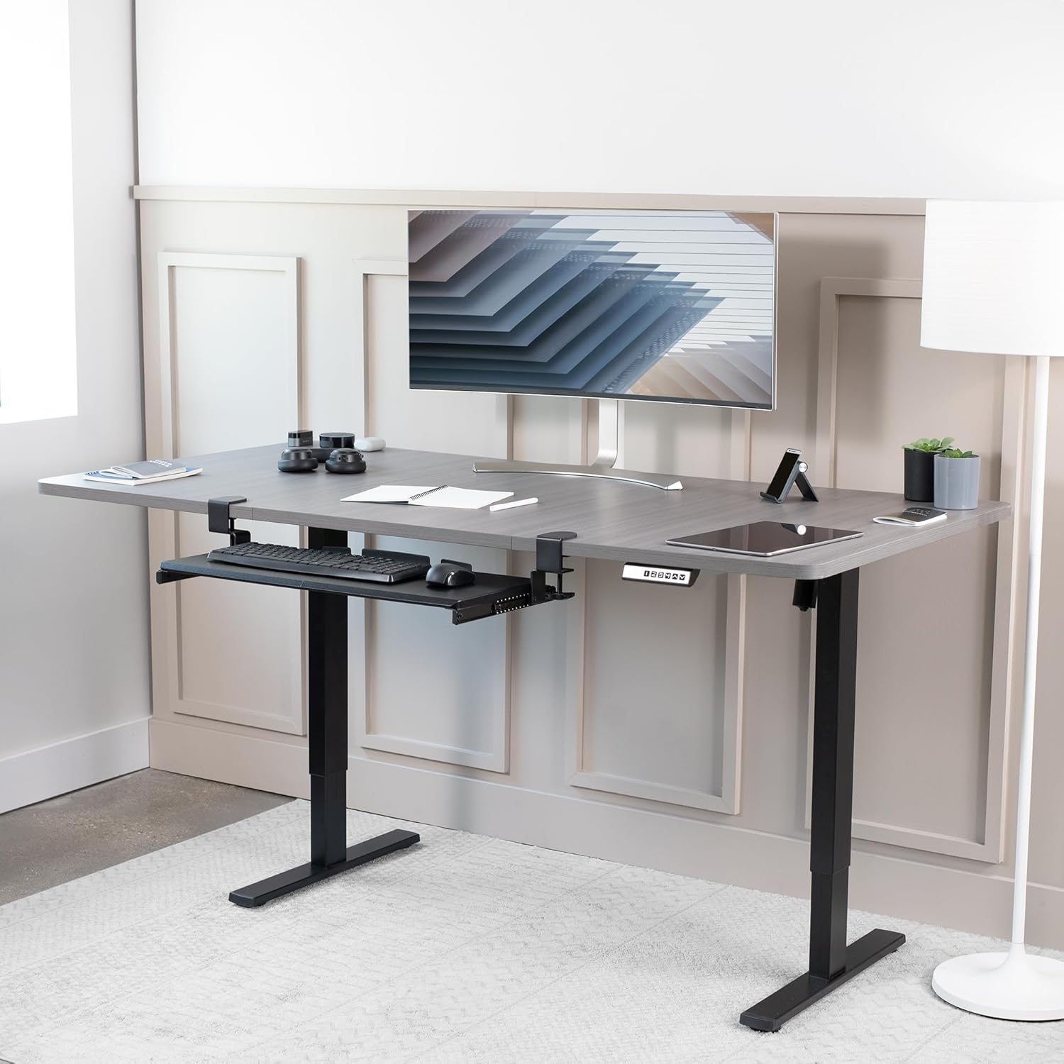 The extra sturdy C clamp mount system securely attaches the tray to the underside of your desk, providing a stable and reliable platform for all your typing needs. The sleek black design adds a modern touch to any workspace, while the smooth sliding mechanism allows for easy access to your keyboard when needed.